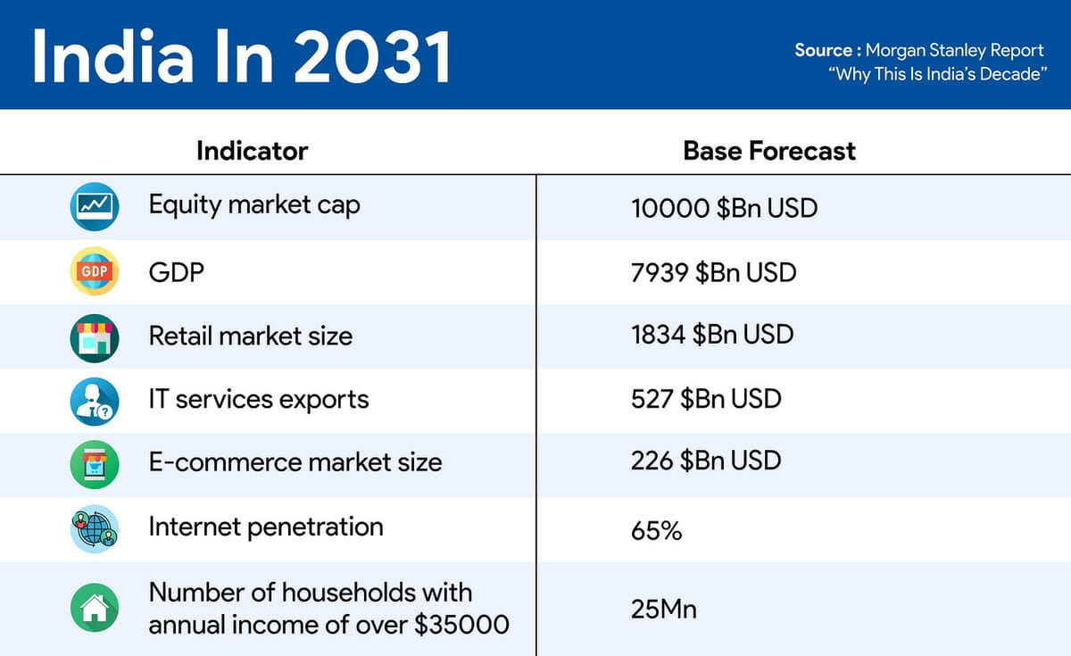 Lower corporate tax rates, government support such as the Productivity-Linked Incentive scheme, and changes to legal frameworks will help improve private-sector profits and attract capital. India will be among the only three economies in the world that will add $500 billion annually to its output to become a nearly $8 trillion economy by 2031, Morgan Stanley forecasts. Acche din, anyone?