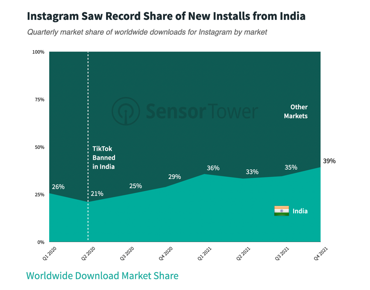 Instagram hasn’t merely taken India’s short-video space by storm but conquered it. Such was Reels’ impact that India accounted for 25% of Instagram downloads in 2020, which further grew to 36% in 2021, according to Sensor Tower data. That’s massive.