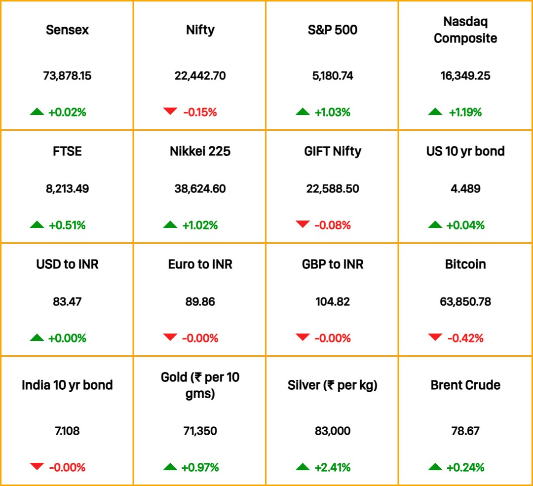 US shares rose sharply as investors swung back to optimism that the Federal Reserve will cut rates. Last week, chances of a reduction were seen as fading for 2024. Taking the cue from Wall Street, Asian equities jumped in morning trade. The GIFT Nifty indicates a flat beginning for Indian shares.