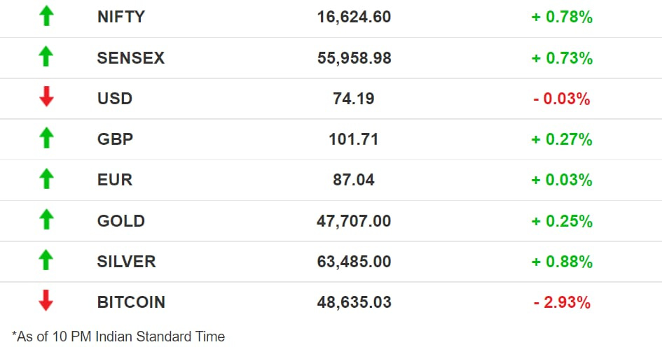 Stocks: Benchmark indices appeared a little more sure-footed, spending the entire day, and closing comfortably, in the green. The broader market also responded well to the charge from blue-chips like Bajaj FinServ, as smallcap and midcap indices gained around 1% each. Among sectoral indices, Metal rebounded from a four-day losing streak to register the highest gain of 2.9%.
