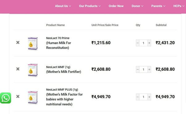 Two units or 20 sachets of NeoLact 70 Prime, which is reconstituted human milk powder, costs ₹2,431 (it’s 400 bucks more on Amazon). The 1g human milk-based fortifiers—meant only for premature babies with special nutritional needs or serious conditions—are far more expensive. At the time of adding these items to cart, NeoLacta did not ask for a prescription or copy of a diagnosis.
