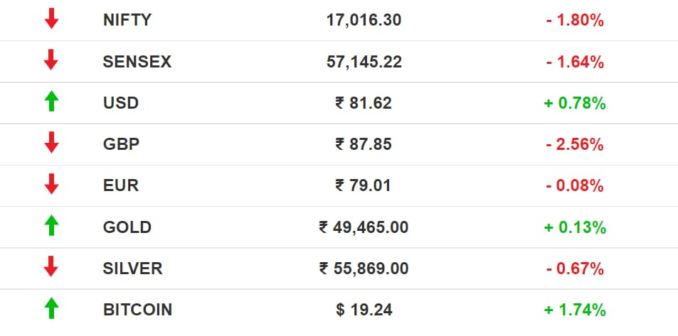 Stocks: Fear of an equally aggressive stance by the US Federal Reserve in the next policy meeting spooked markets on Monday. The RBI is also expected to raise rates later this week. As was the case with major currencies, the rupee tanked to new lows against the US dollar. The Sensex lost over 2,000 points in the last four days, leaving investors poorer by ₹13.30 lakh crore ($163 billion).