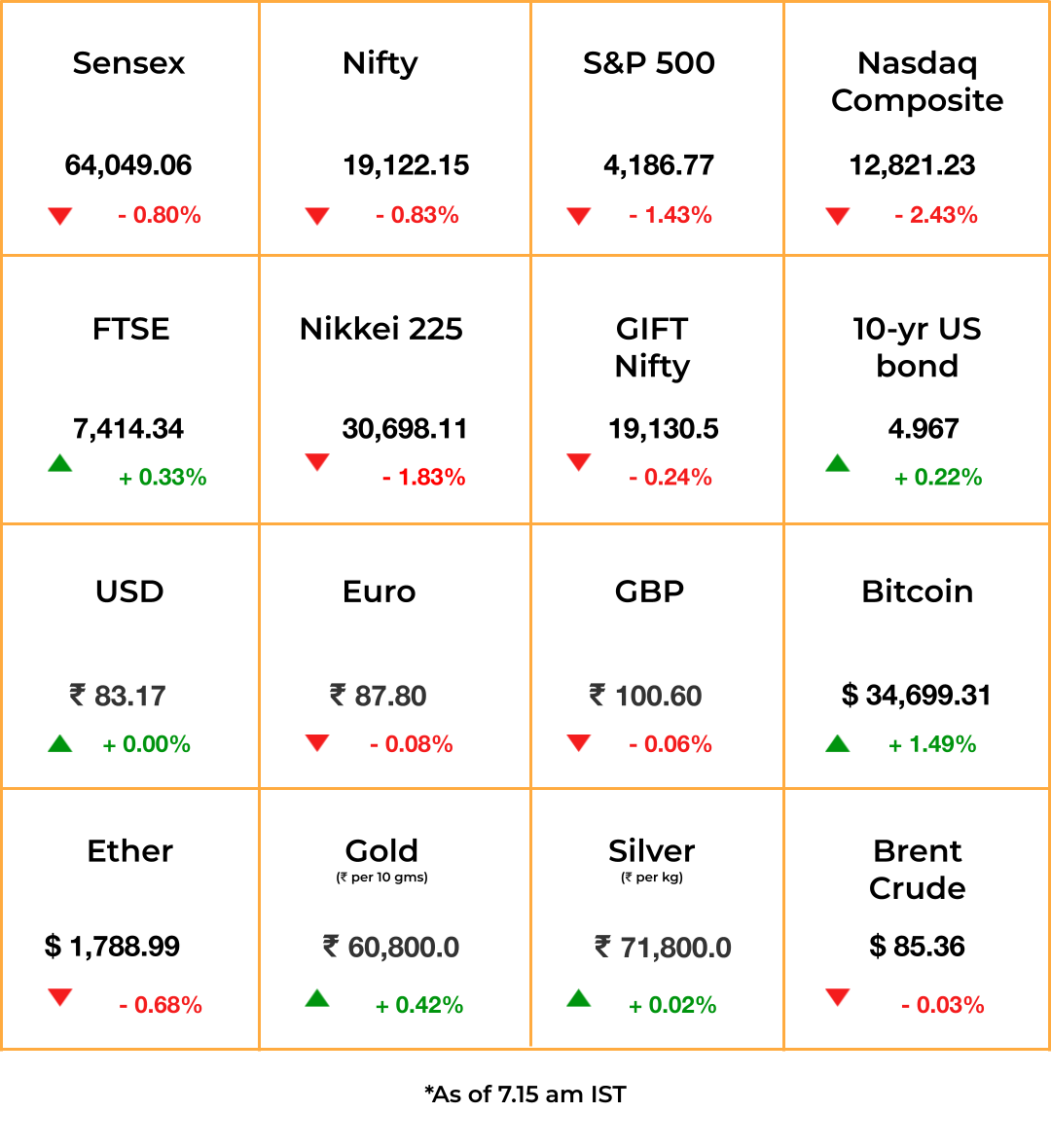 Stocks & Economy: Asian equities were trading deep in the red after a broad sell-off in US markets. Shanghai was the only green zone in Asia. Treasury yields rose on the US economy’s resilience and the tech-heavy Nasdaq slumped after Google’s parent Alphabet revealed a poor quarterly performance. Meta saying that 2024 earnings were uncertain added to the woes.