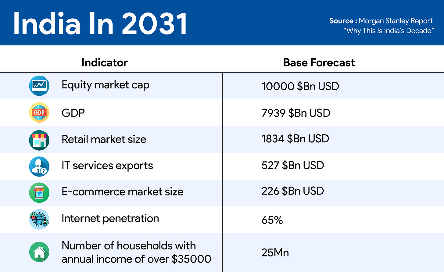 Lower corporate tax rates, government support such as the Productivity-Linked Incentive scheme, and changes to legal frameworks will help improve private-sector profits and attract capital. India will be among the only three economies in the world that will add $500 billion annually to its output to become a nearly $8 trillion economy by 2031, Morgan Stanley forecasts. Acche din, anyone?
