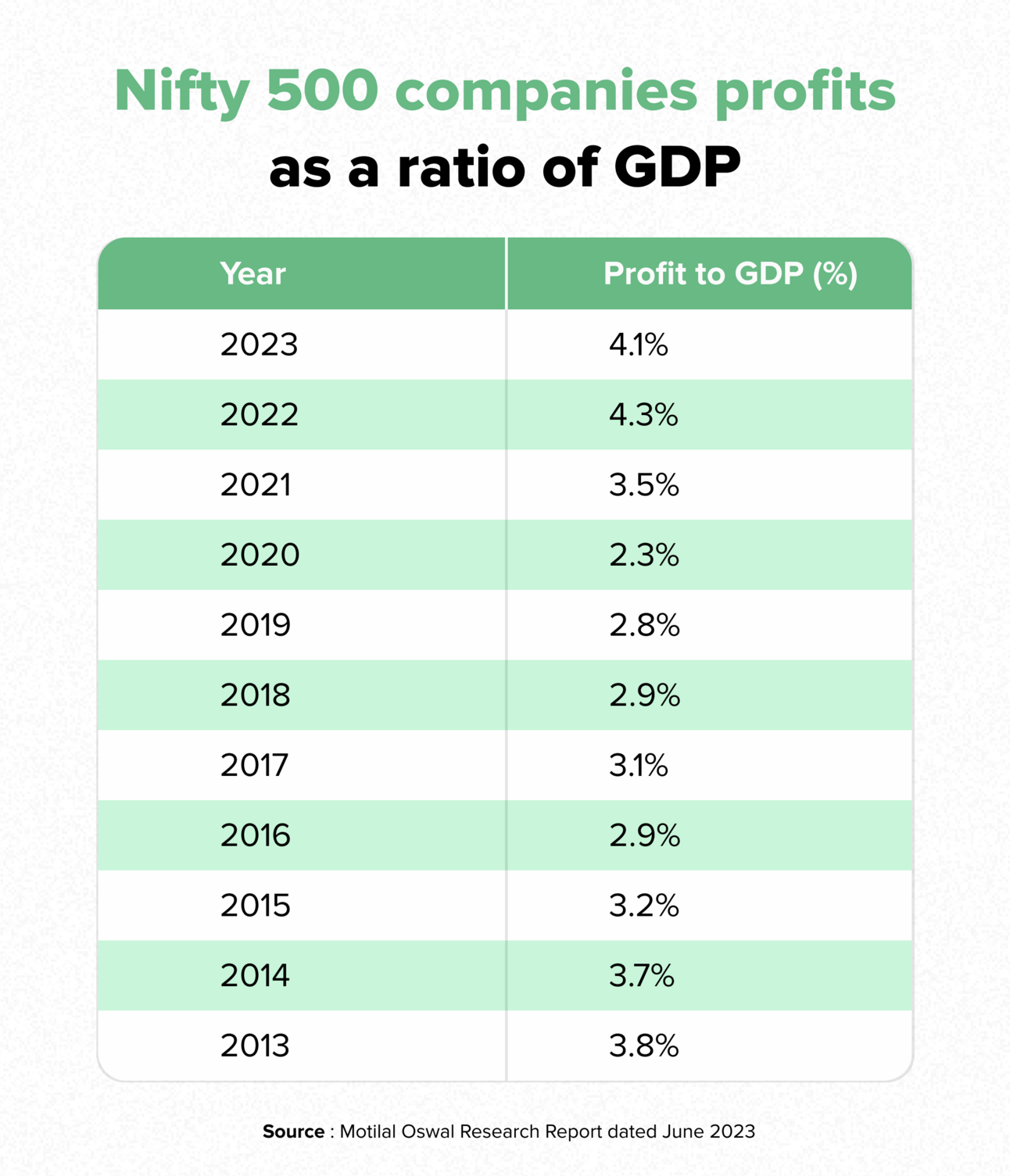 Broking firm Motilal Oswal expects the 50 Nifty companies to grow at an average of 20% in FY24. The firm estimates that the profit-to-GDP ratio for Nifty’s top 500 companies (that account for 90% of market capitalisation) slipped marginally to 4.1% in FY23 from a decade high of 4.3% in FY22. Their profits were stagnant at ₹4 trillion-₹5 trillion (~$48 billion-$60 billion) between 2014 and 2020, but jumped to ₹10.2 trillion-₹11.1 trillion (~$121 billion-$134 billion) in 2022-23. But that growth has come from better margins and not expanding sales.