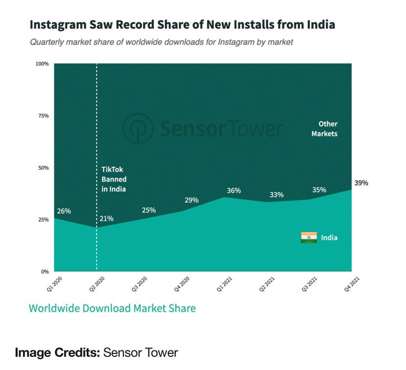 At the time of the TikTok ban, “approximately 21% of Instagram were from India.” That number rose to “39% by Q4 2021.” On a year-on-year basis, India contributed to about a fourth of the app’s downloads in 2020. Cut to 2021, and that number grew to 36%.