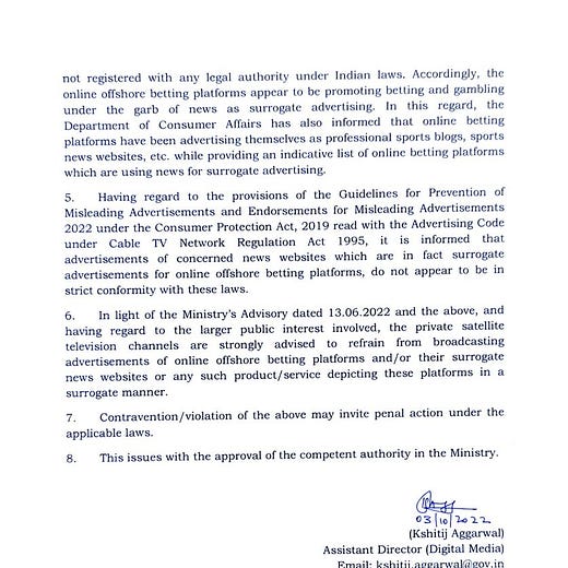 It took until early October for the Indian government to take things a bit more seriously. On October 3, the MIB issued slightly sterner and more detailed advisories to television and digital media. The advisories included screenshots of the surrogate ads that were shown on sports channels and streaming platforms. And the advisory to the TV media also carried a warning: “Contravention/violation of the above may invite penal action under the applicable laws.”