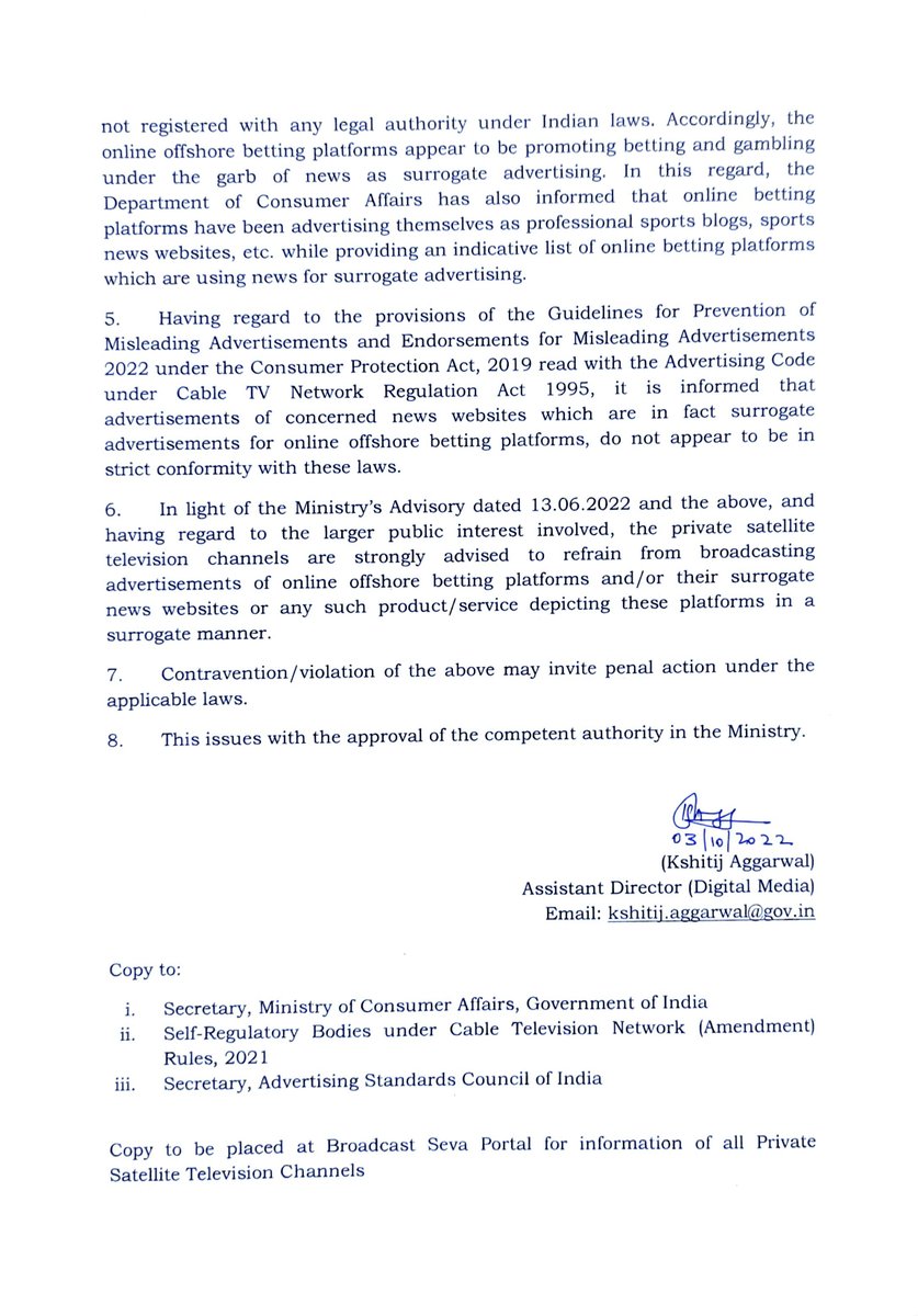 📢 Ministry of Information and Broadcasting issues 'Advisory on Advertisement of Online Betting Platforms' to Private Satellite TV Channels. ➡️ For more details👇 | |||