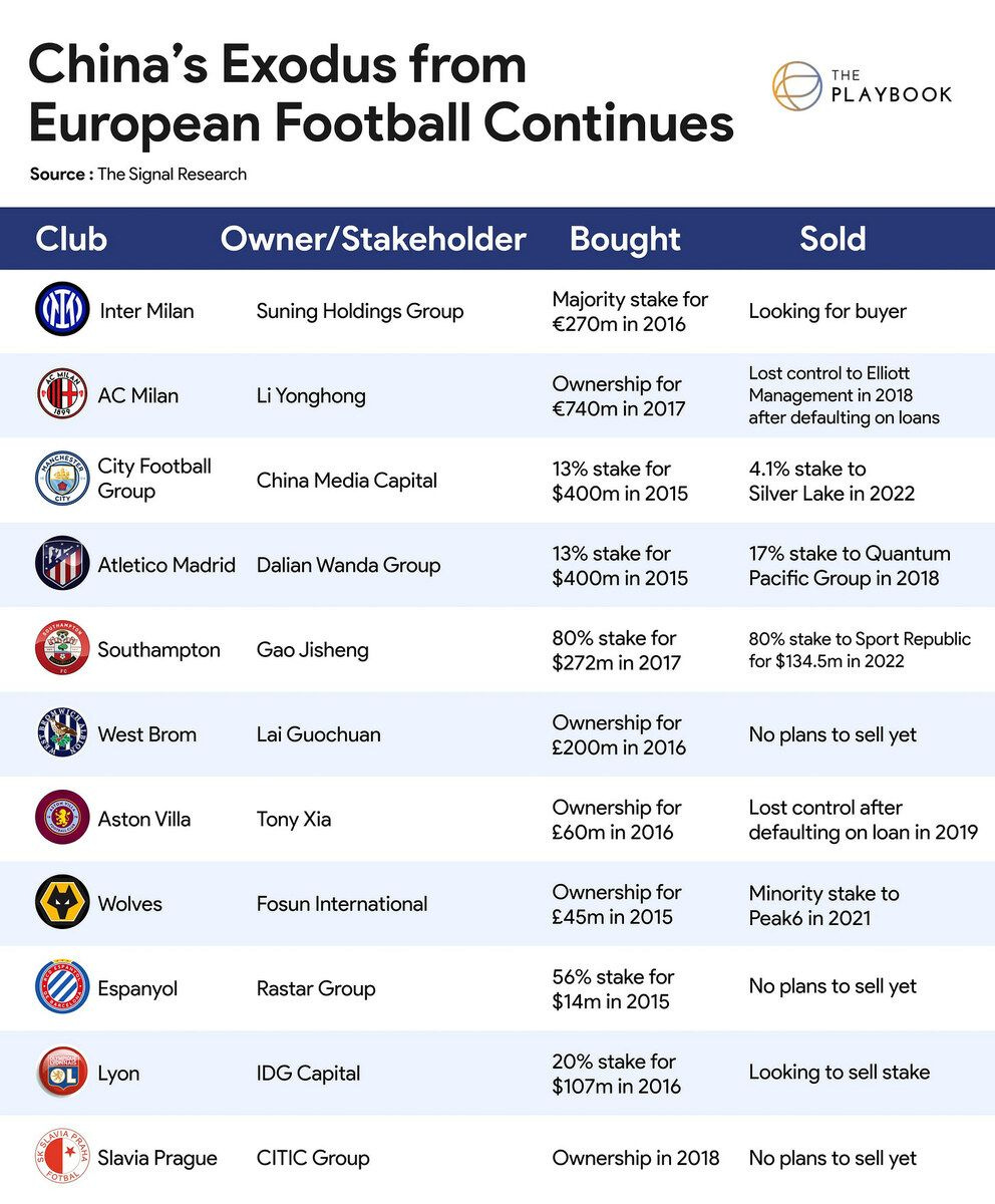 ⚽️🇨🇳 Chinese electronics retailer Suning is reportedly looking to sell Inter Milan, six years after paying €270 million ($260 million) for a majority stake in the Italian club. Suning is the latest Chinese investor looking to reduce its exposure to European football amid economic and political troubles back home.
