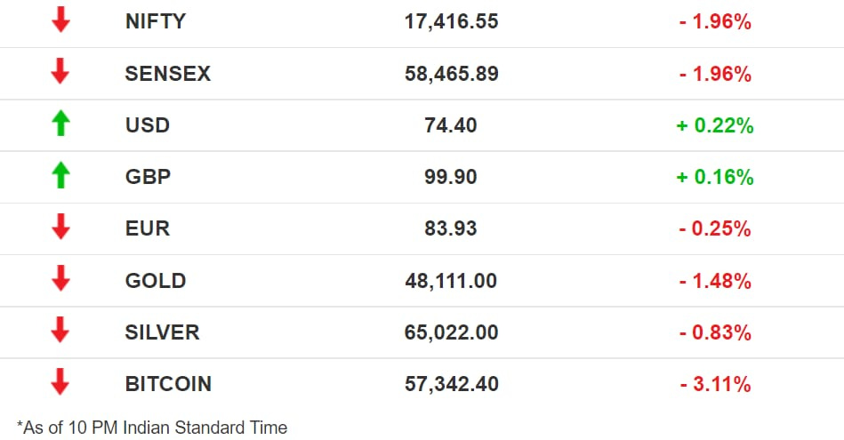 Stocks: Benchmark indices recorded their fourth straight trading session in the red with their steepest single-day fall in seven months. India VIX, a gauge of volatility, soared 18%. Among the factors contributing to the slide were the reimposition of lockdowns in Austria and some other nations to combat a surge in Covid-19, and a fall in crude oil prices off the back of the US releasing some of its reserves.