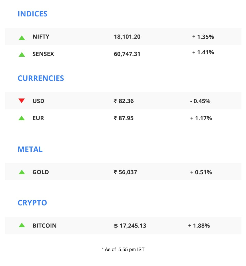 Stocks: Domestic benchmark indices ended higher after the United States’ Federal Reserve signalled a slow rate hike. Net profit for TCS jumped 11% y-o-y to ₹10,846 crore ($1.3 billion) for the third quarter ending December 2022. News of China reopening its borders also aided stocks and crude oil prices.