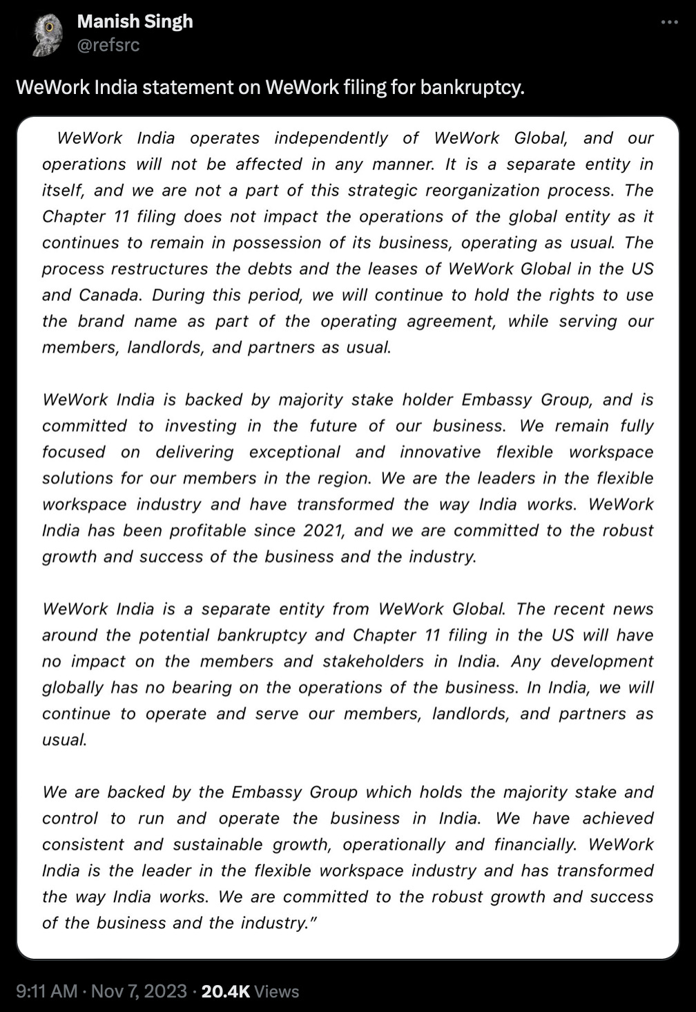 That Neumann was wrong and intrepid SoftBank chief Masayoshi Son was even more wrong about Neumann was definitively proven right when WeWork filed for bankruptcy on Monday. It will help the company restructure debt and renegotiate lease contracts. WeWork outside the US and Canada and its franchises will be unaffected. WeWork India is majority-owned by the Embassy Group and is a profitable venture.