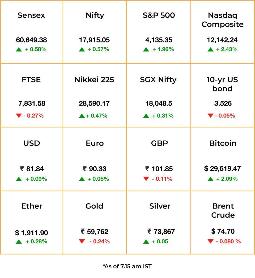 In the US, upbeat earnings of tech majors such as Meta and Intel (although Amazon fell, erasing 12% gains, post market because of a coming slowdown in cloud growth), steered indices higher while fears of a contagion from First Republic Bank’s recent troubles receded. Indices gained despite the setback on growth and acceleration in inflation in Jan-Mar. However, the labour market, which usually collapses during a recession, remained resilient.