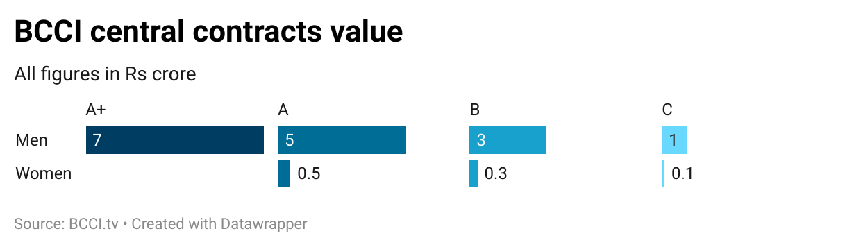 Secondly, the match fee is just one part of the income earned by centrally-contracted cricketers. The BCCI also has annual retainers, with four different pay grades for men and three for women. The highest-earning male cricketer gets ₹7 crore (~$850,000) per year. On the women’s side, it’s just ₹50 lakh (~$60,600).