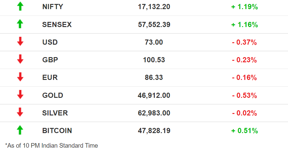 Stocks: A late surge from the bulls saw both benchmark indices close with gains of over 1% each. Bharti Airtel and the Bajaj financial twins were among the day’s biggest gainers while Nestle India and RIL were the index laggards. All NSE sectoral indices except for Media closed in the green.