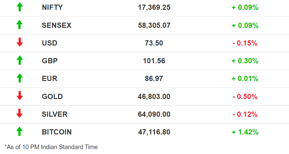 Stocks: Indian benchmarks spent most of yesterday in the red but staged a late recovery to close trading for the day and the week marginally in the green. Among the sectoral indices, FMCG and Metal outperformed while Realty showed weakness. A couple of Future Group stocks hit their upper circuits after the Supreme Court stayed any proceedings in connection with its deal with Reliance.