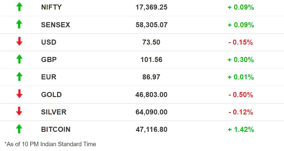 Stocks: Indian benchmarks spent most of yesterday in the red but staged a late recovery to close trading for the day and the week marginally in the green. Among the sectoral indices, FMCG and Metal outperformed while Realty showed weakness. A couple of Future Group stocks hit their upper circuits after the Supreme Court stayed any proceedings in connection with its deal with Reliance.