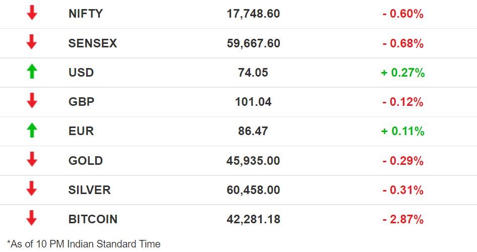 Stocks: A sharp rise in US treasury bond yields and Brent crude oil prices pushed Indian benchmark indices to a close in the red. They did, however, stage a recovery from mid-day lows, with the Sensex bouncing back from 1,000 points in the red to close 410 points lower. Among the sectoral indices, Metal and Energy made the highest gains, while IT and Realty were the biggest drags.