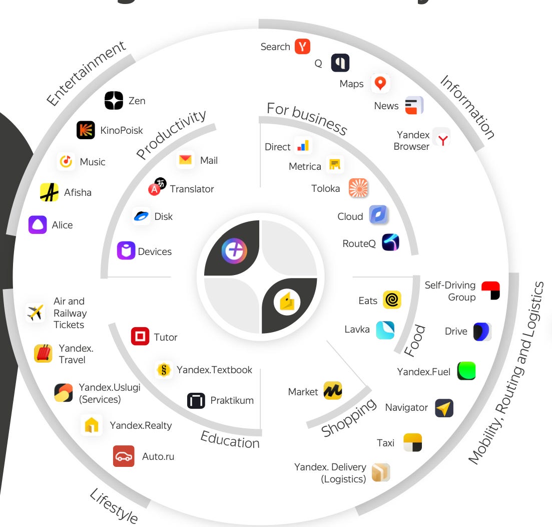 Yandex is a conglomerate, not unlike Tencent. It has 19,000 employees across 30 global offices and 50-plus services, from search engine (60% market share in Russia) to marketplace (Yandex Market), ride-hailing (Yandex Taxi), paid music streaming (Yandex Music), grocery delivery (Yandex Lavka) and its own Alexa and Siri-like AI assistant, Alice.
